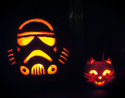 I am getting a little more adventurous with it year after year. In the past I have done the normal jack-o-lantern faces, a bat in front of a full moon, an owl, a monster, "ABC", stars, and a zombie. This year, Kade wanted a cat- not surprising, since he asks if we can get a cat every single day! That was easy enough. Then Jer found all these pictures of amazing Star Wars pumpkins, and was like, "do that!"